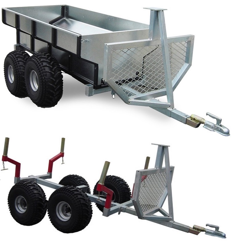 Kombivagn med hjulboggie för din ATV/UTV med mycket bra framkomlighet. Tippbart insatsflak för de lite större jobben. Ta bort flaket och sätt dit de fyra medföljande stöttorna så har du motsvarigheten till vår populära timmervagn. Ett stort tillbehörsutbud såsom kran, vinsch, timmersax, stödben m.m gör detta till en riktigt pålitlig multivagn. Löstagbara lämmar fram och bak för transport av längre föremål.